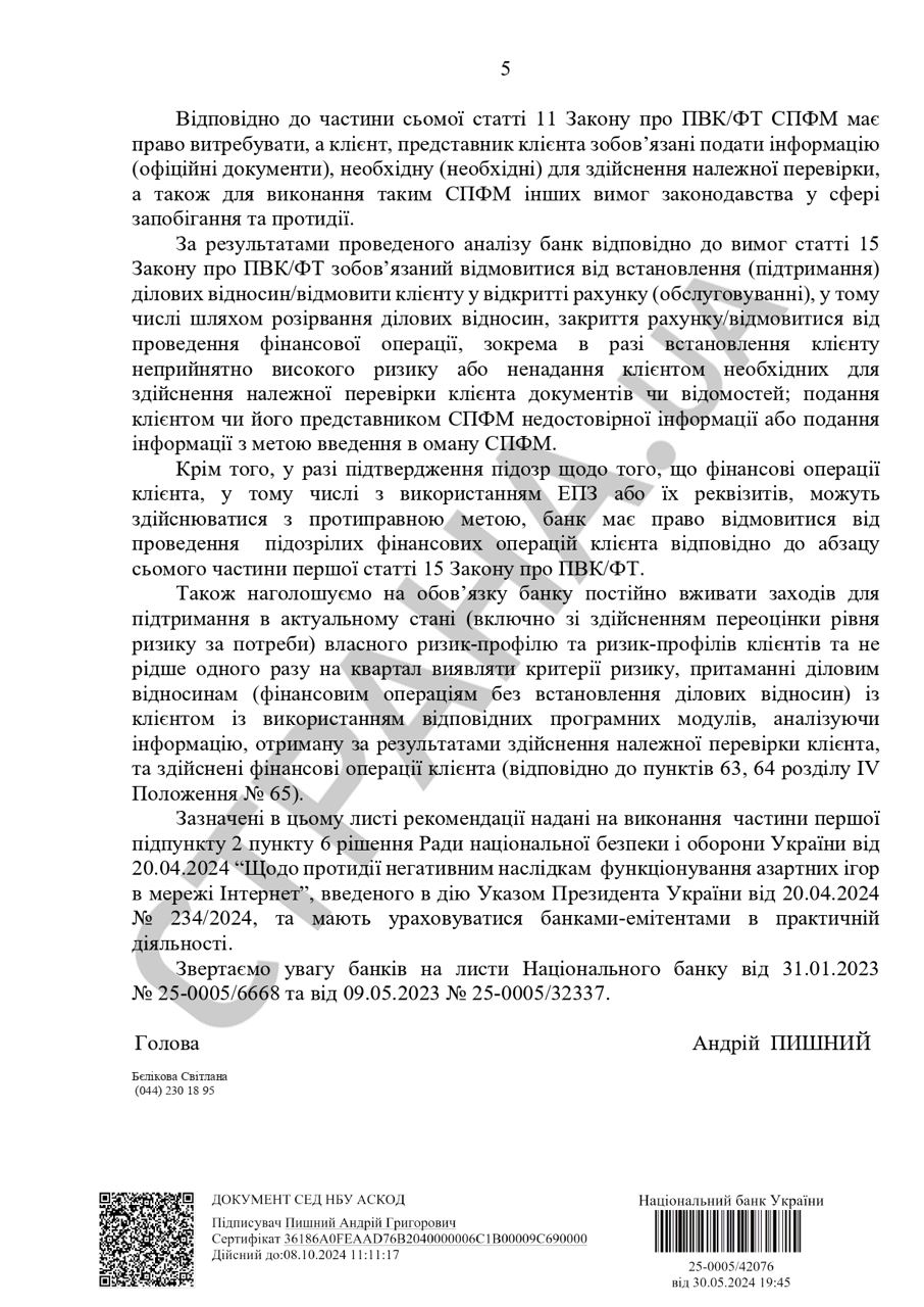 В письме №25-0005/42076 Национальный банк дал несколько новых указаний по финансовому мониторингу: