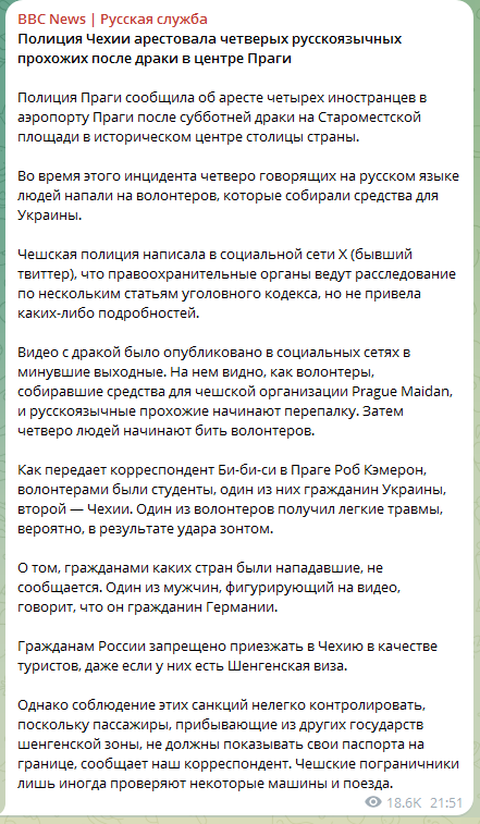 О том, гражданами каких стран являются нападавшие, не сообщается. Один из попавших в кадр мужчин говорит, что он гражданин Германии. Гражданам России запрещено приезжать в Чехию в качестве туристов, даже если у них есть Шенгенская виза.