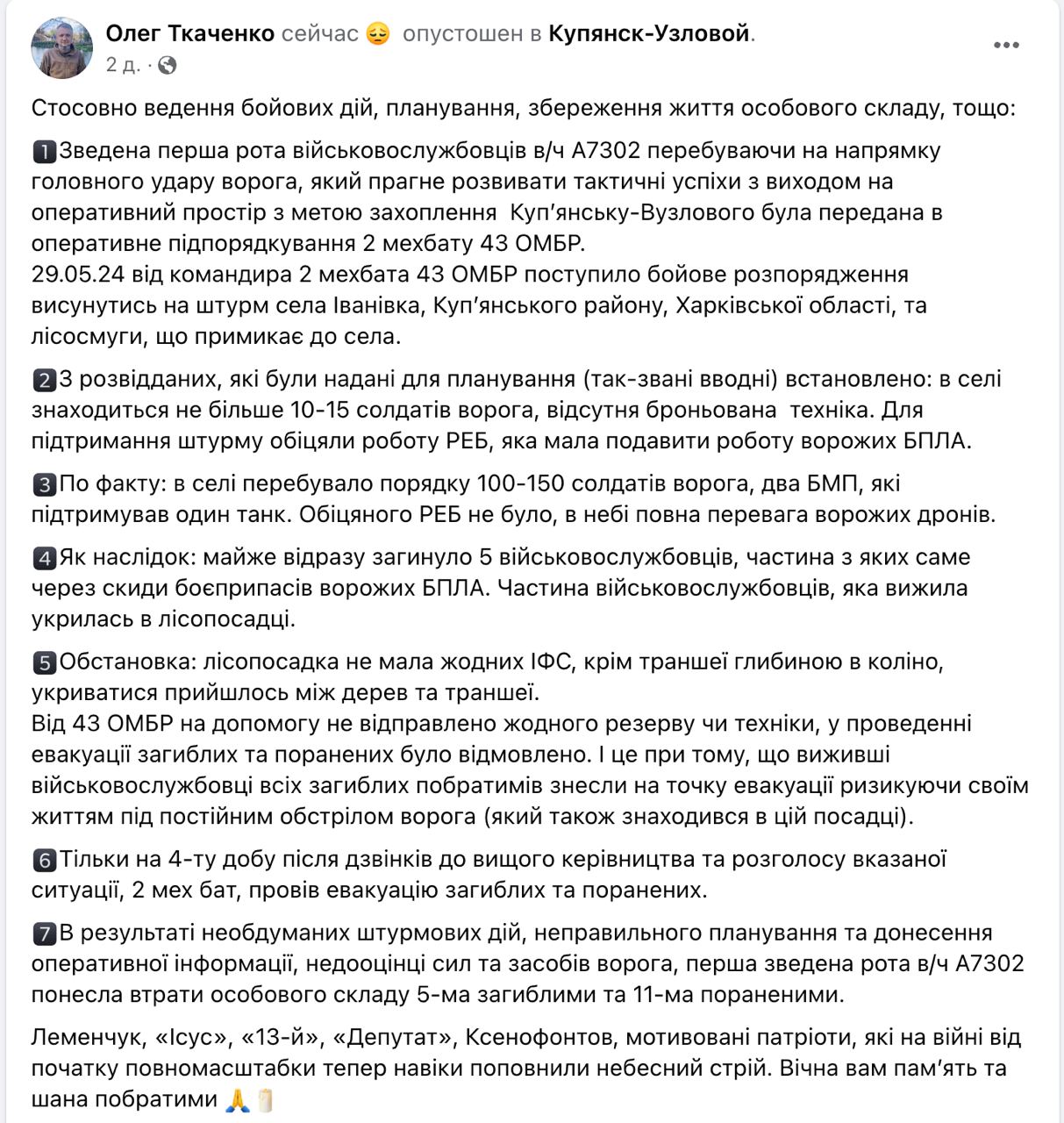 "По факту: в селе находилось порядка 100-150 солдат врага, две БМП, которые поддерживал один танк. Обещанного РЭБ не было, в небе полное превосходство вражеских дронов. Как следствие: почти сразу погибли 5 военнослужащих, часть из которых именно из-за сбросов боеприпасов вражеских БПЛА. 11 ранены", - сообщает Ткаченко.
