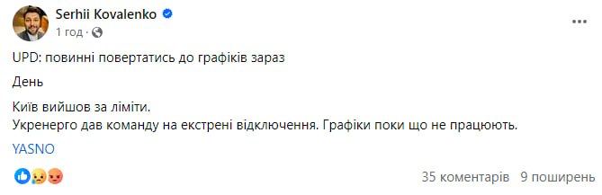 Киев тоже возвращается к графикам отключения света, сообщил в Фейсбуке гендиректор Yasno Сергей Коваленко.