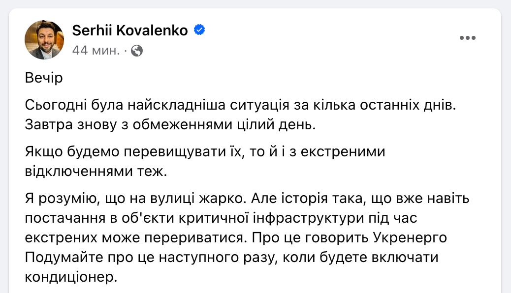 "Я понимаю, что на улице жарко. Но история такова, что уже даже снабжение объектов критической инфраструктуры во время экстренных (отключений - Ред.) может прерываться. Об этом говорит "Укрэнерго". Подумайте об этом в следующий раз, когда будете включать кондиционер", - призвал Коваленко.