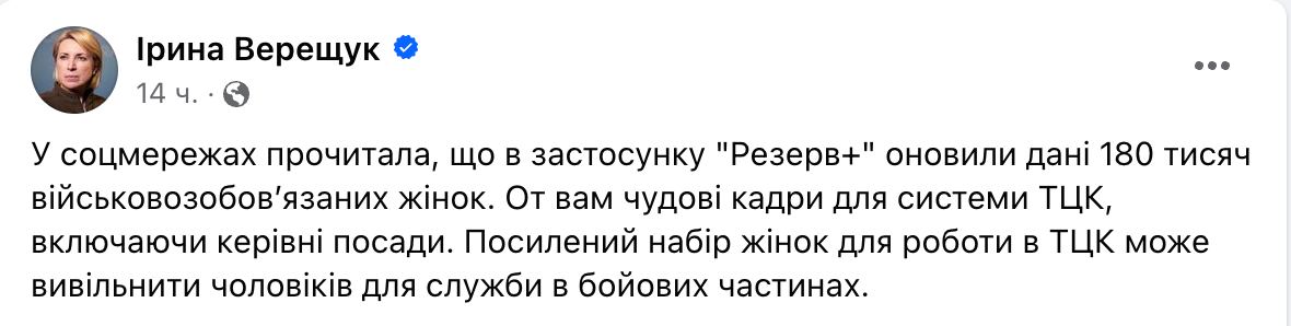 "В соцсетях прочитала, что в приложении "Резерв+" обновили данные 180 тысяч военнообязанных женщин. Вот вам отличные кадры для системы ТЦК, включая руководящие должности. Усиленный набор женщин для работы в ТЦК может высвободить мужчин для службы в боевых частях", - написала чиновница.