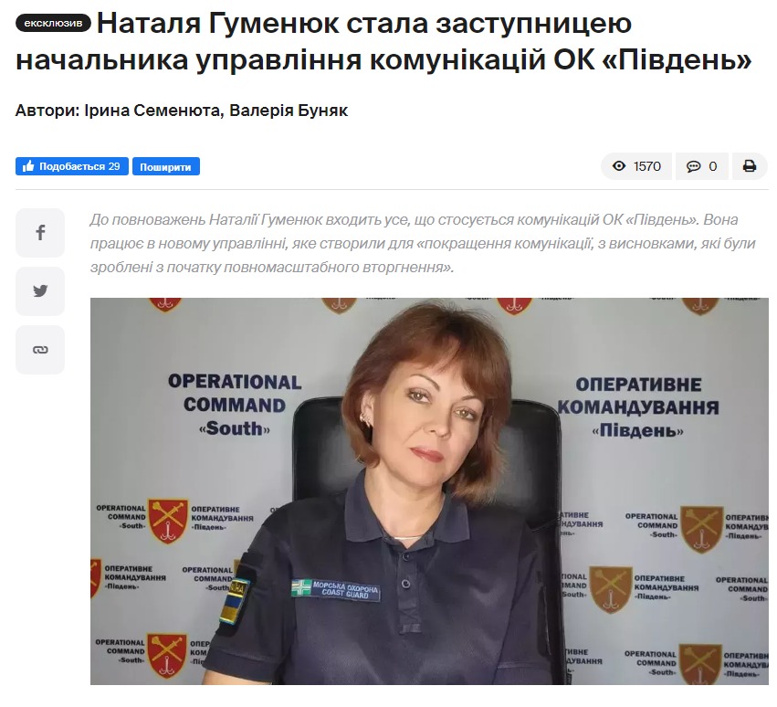 Бывшая пресс-секретарь Сил обороны юга Наталья Гуменюк получила новое назначение: она стала заместителем начальника управления коммуникаций оперативного командования "Юг".