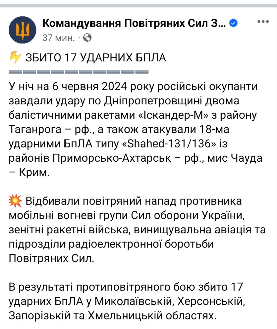 7.46 Ночью РФ ударила по Днепропетровской области двумя ракетами "Искандер - М". Об этом сообщили Воздушные силы.
