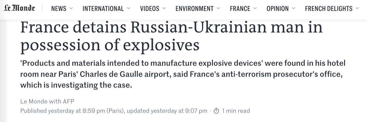 Le Journal du Dimanche добавляет, что мужчину подозревают в намерении подорвать военное оборудование, которое Франция отправляет Украине.