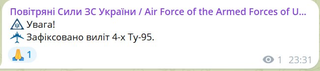 23.36 Воздушные силы сообщают о взлете четырех стратегических бомбардировщиков Ту-95мс с аэродрома "Оленья" в Мурманской области РФ.