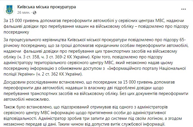 Как рассказали в прокуратуре, 65-летний посредник за деньги помогал юридическим лицам переоформить автомобили, предоставляя фальшивые справки о нахождении транспортных средств на воинском учете. Вместе с ним подозрение получил администратор сервисного центра МВД, который незаконно снабжал посредника информацией с ограниченным доступом из Информационного портала Национальной полиции Украины.