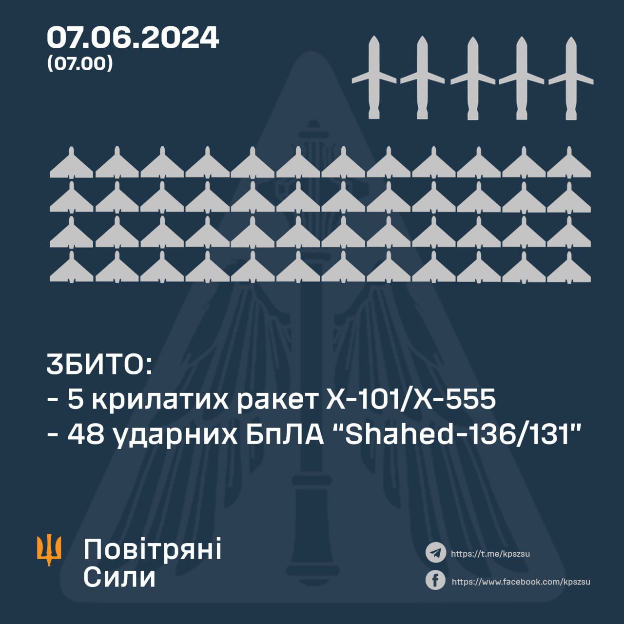 По сообщению ВСУ, были сбиты все 5 ракет и 48 беспилотников.