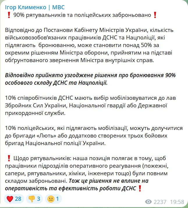 «Соответственно, принято согласованное решение о бронировании 90% личного состава ГСЧС и Нацполиции», – сообщил Клименко.
