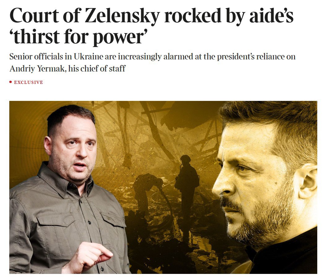 "Растет беспокойство по поводу того, что Зеленский все больше полагается на горстку льстивых голосов внутри страны, и это опасение становится еще более острым, поскольку число чиновников, имеющих прямой доступ к президенту, сокращается, а команда Ермака растет", - говорится в статье.