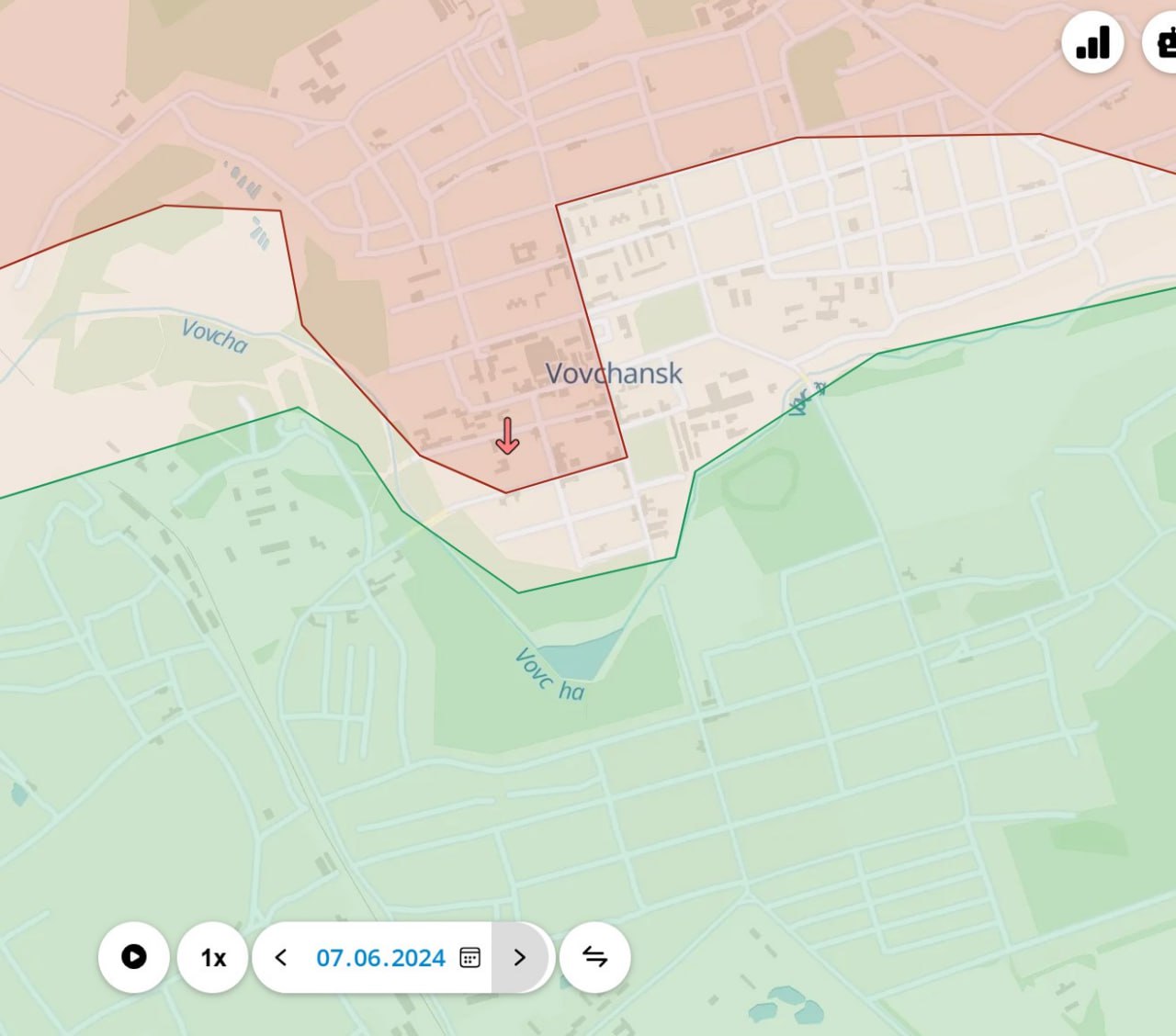 По данным паблика Deep State, никаких изменений на фронте в районе Волчанска не произошло. На карте ресурса обозначено, что в городе атакуют российские войска.
