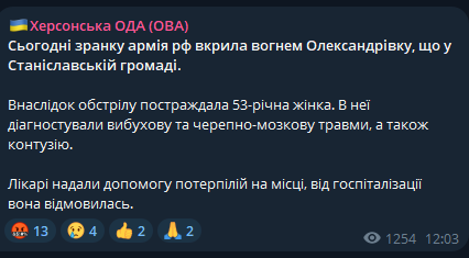 13:39 Утром, 9 июня, российские войска обстреляли село Александровка в Станиславской громаде Херсонской области.
