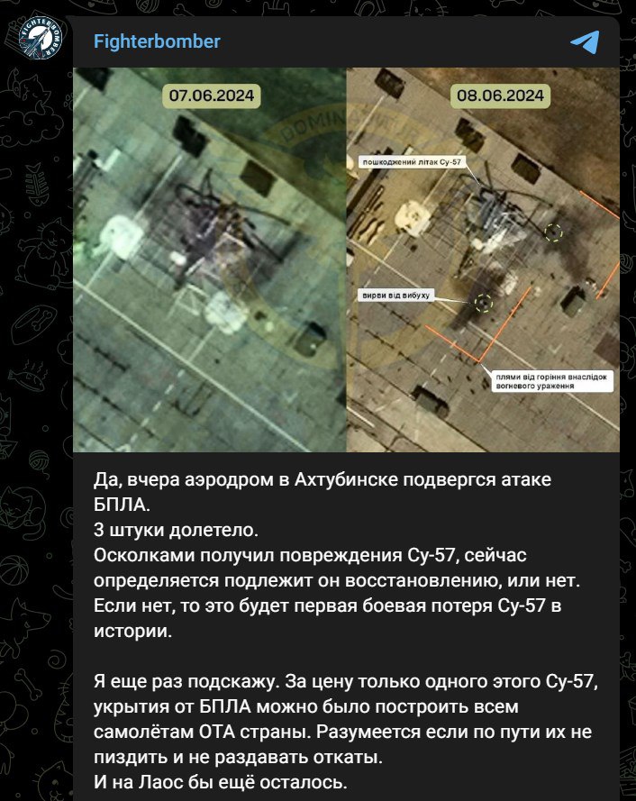 Также российские авиационные паблики подтверждают удар по Су-57 в Ахтубинске Астраханской области.