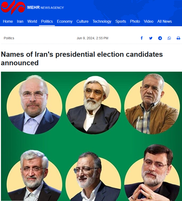В воскресенье, 9 июня, Министерство внутренних дел Ирана опубликовало список из шести кандидатов, которые получили разрешение на участие в президентских выборах после гибели при крушении вертолета президента Эбрахима Раиси. Утверждение кандидатов дает им право начать предвыборную гонку.
