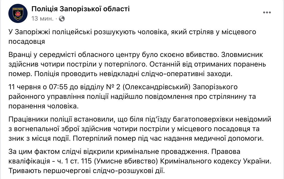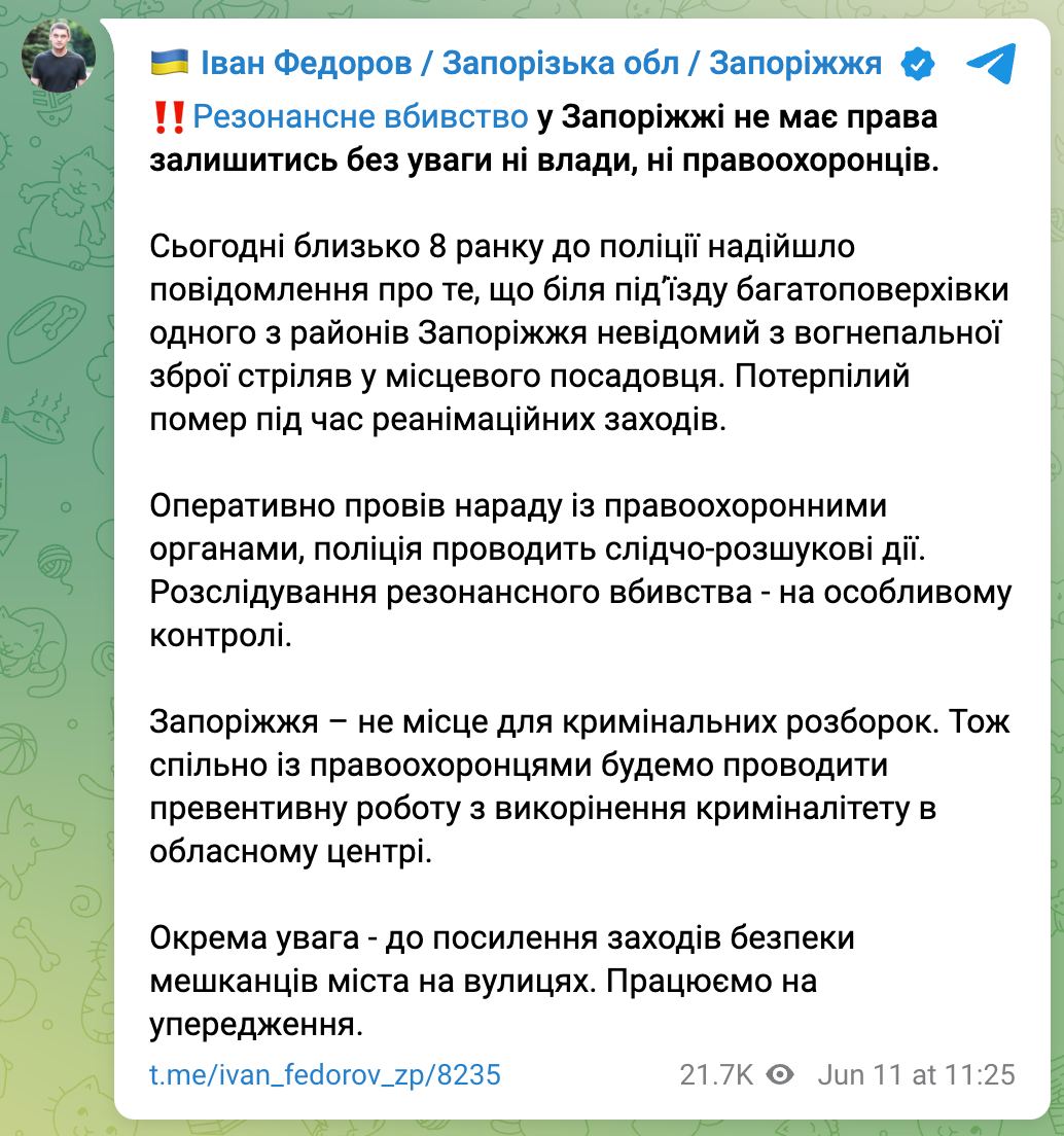 "Запорожье не место для криминальных разборок. Поэтому совместно с правоохранителями будем проводить превентивную работу по искоренению криминалитета в областном центре", - написал глава ОВА.