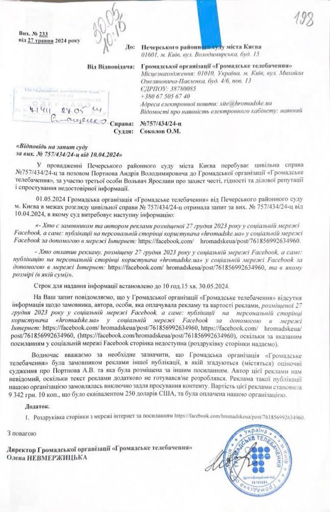 При этом раньше "Громадське" заверяло суд, что не распространяло информацию о Портнове и что у них "нет стопроцентной уверенности, что именно они распространили эту информацию", а названия "ОО "Общественное телевидение", "hro", "hromadske", "hromadske.ua", "pro hromadske" не имеют к ним отношения.