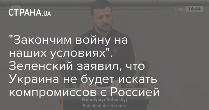 "Мы не передадим эту войну нашим детям, мы её закончим. И мы закончим эту войну на наших условиях. Украинцы заслуживают спокойствия и прекращения войны, которое не оставит сомнений в том, кто победил. Время компромиссов прошло. Всё кончено с тех пор, как Россия начала бомбить наши города", - заявил президент.