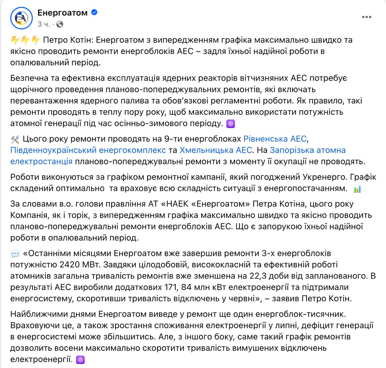 По словам и. о. главы правления Петра Котина, в этом году компания, как и в прошлом году, с опережением графика проводит планово-предупредительные ремонты энергоблоков АЭС.