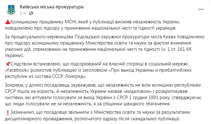 Как установило следствие, мужчина на своей странице в социальной сети разместил публикацию с заголовком "О выходе Украины и прибалтийских республик из состава СССР. Лонгрид". В посте чиновник написал, что независимость не всем бывшим республикам СССР пошла на пользу. А независимость Украины назвал "кидаловом" и раскритиковал листовки, которые агитировали голосовать за выход Украины из СССР 1 декабря 1991 года, утверждая, что люди голосовали не за независимость, а за обещания быстрого обогащения.