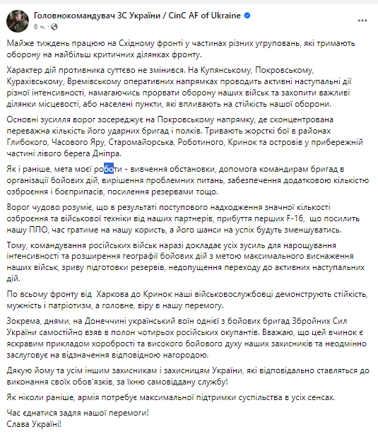"Враг прекрасно понимает, что в результате постепенного поступления значительного количества вооружения и военной техники от наших партнеров, прибытия первых F-16, что усилит нашу ПВО, время будет играть в нашу пользу, а его шансы на успех будут уменьшаться", - написал Сырский.
