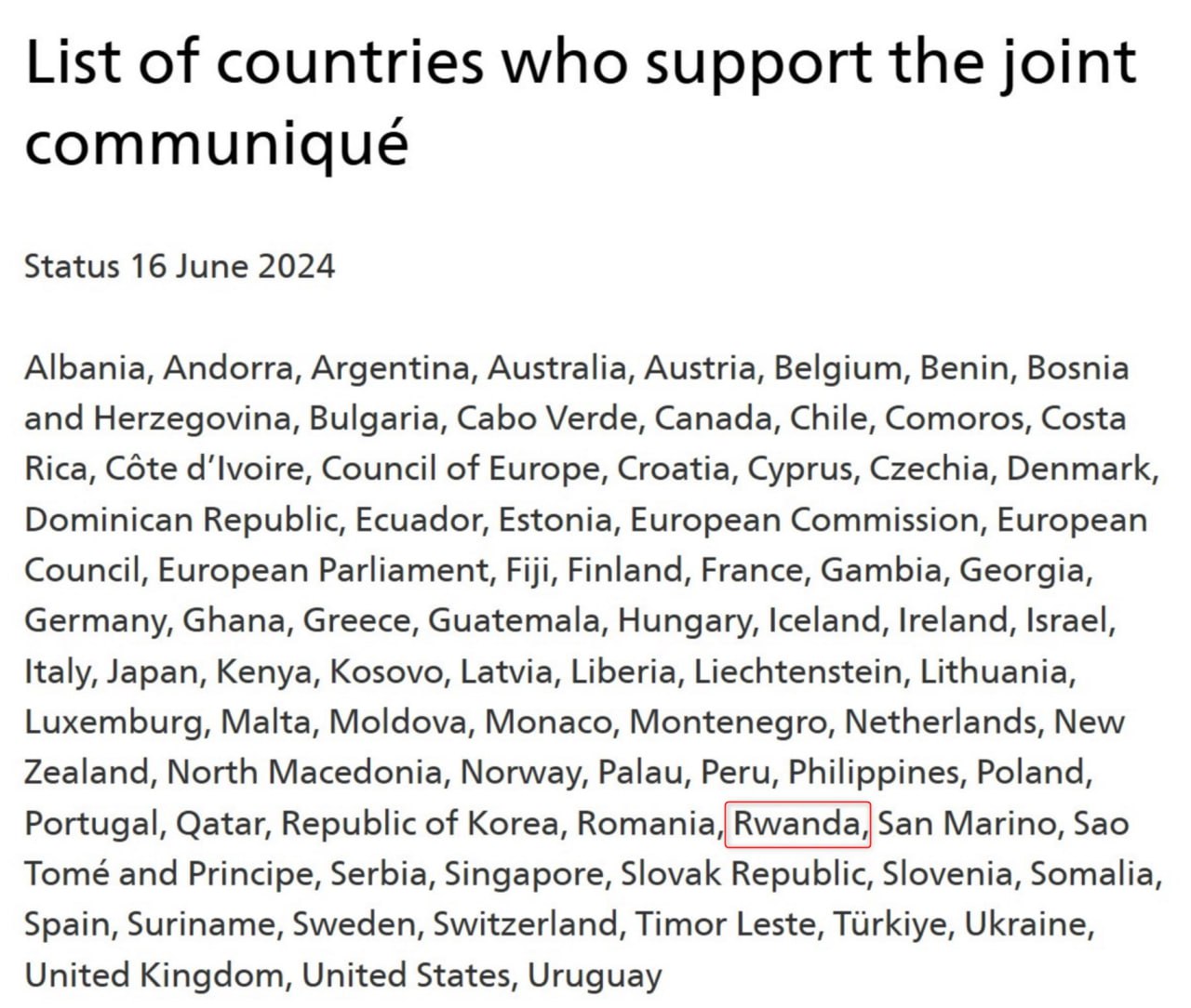 Из итогового коммюнике исчезла подпись еще одной страны - Руанды. На сайте МИД Швейцарии этой страны в перечислении подписантов уже нет, хотя еще вчера она там была (второй скриншот).