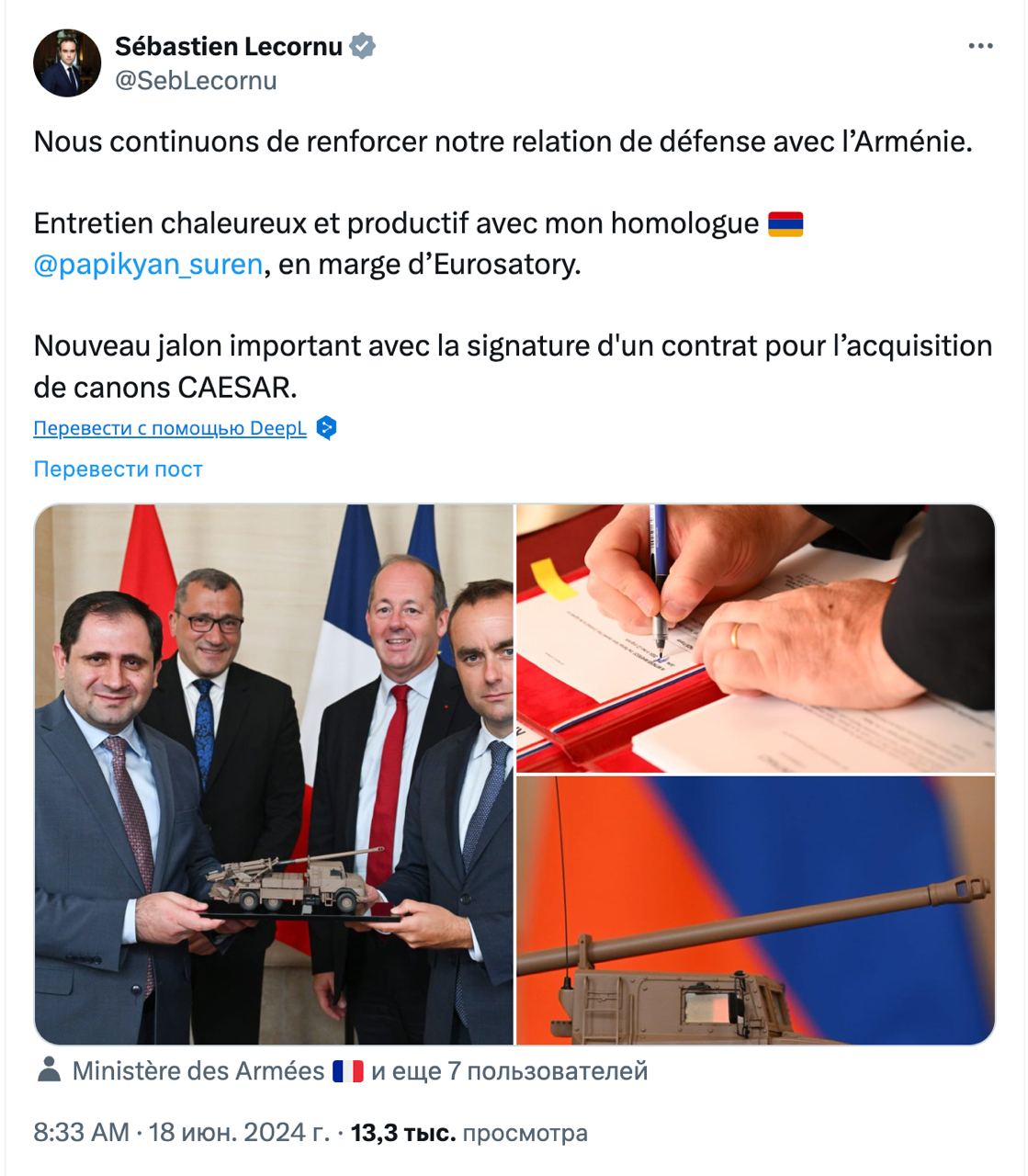 "Мы продолжаем укреплять наши отношения с Арменией в области обороны... Новая важная веха – подписание контракта на приобретение пушек Caesar", - написал Лекорню.