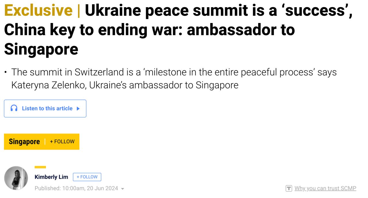 12:05 Украина допускает свое участие в китайском мирном саммите с участием РФ, заявила посол Украины в Сингапуре Екатерина Зеленко в комментарии South China Morning Post.
