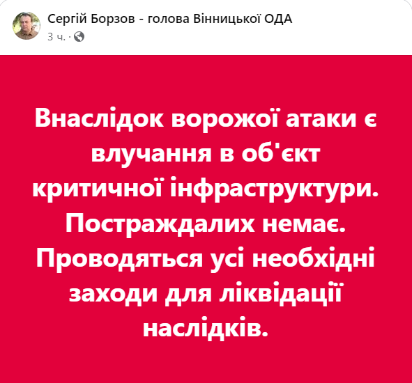 В Винницкой области обломками "Шахеда" повреждён объект критической инфраструктуры.