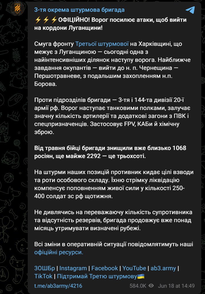 Калюжная в соцсетях раскритиковала "политиков и их медийных друзей" из 3-й штурмовой бригады, которые 18 июня заявляли об угрозе масштабного наступления РФ в сторону Боровой (на скриншоте). И говорили, что у бригады отсутствуют резервы на этом направлении.