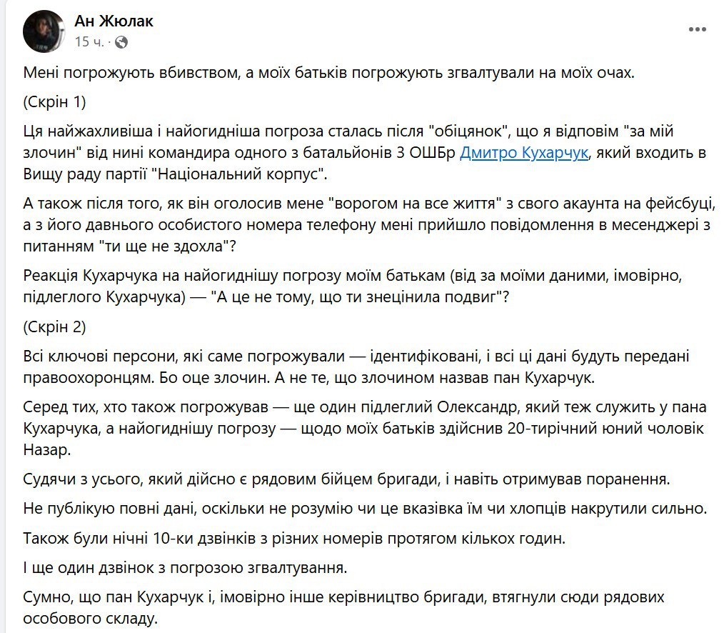 По данным Калюжной, эту угрозу написал некто Назар, который является рядовым 3-й штурмовой бригады. Другие оскорбительные сообщения писал подчиненный Кухарчука Александр. Журналистка заявляет, что данные уже переданы в полицию.