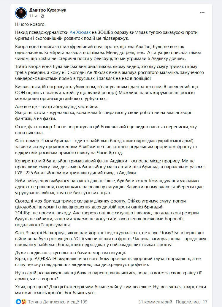 Комментируя эти оскорбления в личной переписке с Калюжной Кухарчук, по ее данным, объяснил их тем, что она "обесценила подвиг".