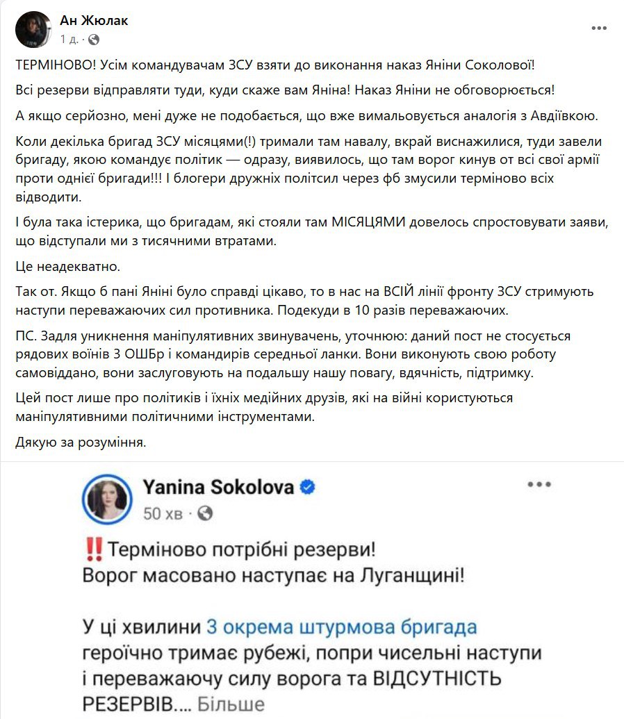"Когда несколько бригад ВСУ месяцами (!) держали там оборону, крайне истощились, туда завели бригаду, которой командует политик (Андрей Билецкий - Ред.) и сразу оказалось, что там враг бросил все свои армии против одной бригады. И блогеры через ФБ побудили оттуда всех выводить", - написала Калюжная, обвинив 3-ю штурмовую в самопиаре.