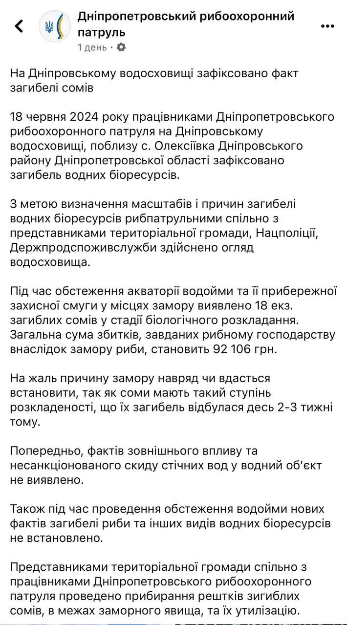В рыбоохранном патруле добавили, что общая сумма ущерба, причиненного рыбному хозяйству из-за мора сомов, составила 92 106 гривен.