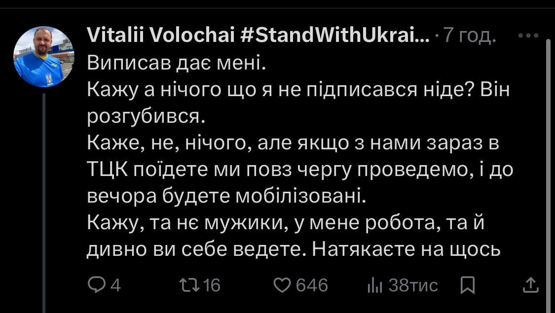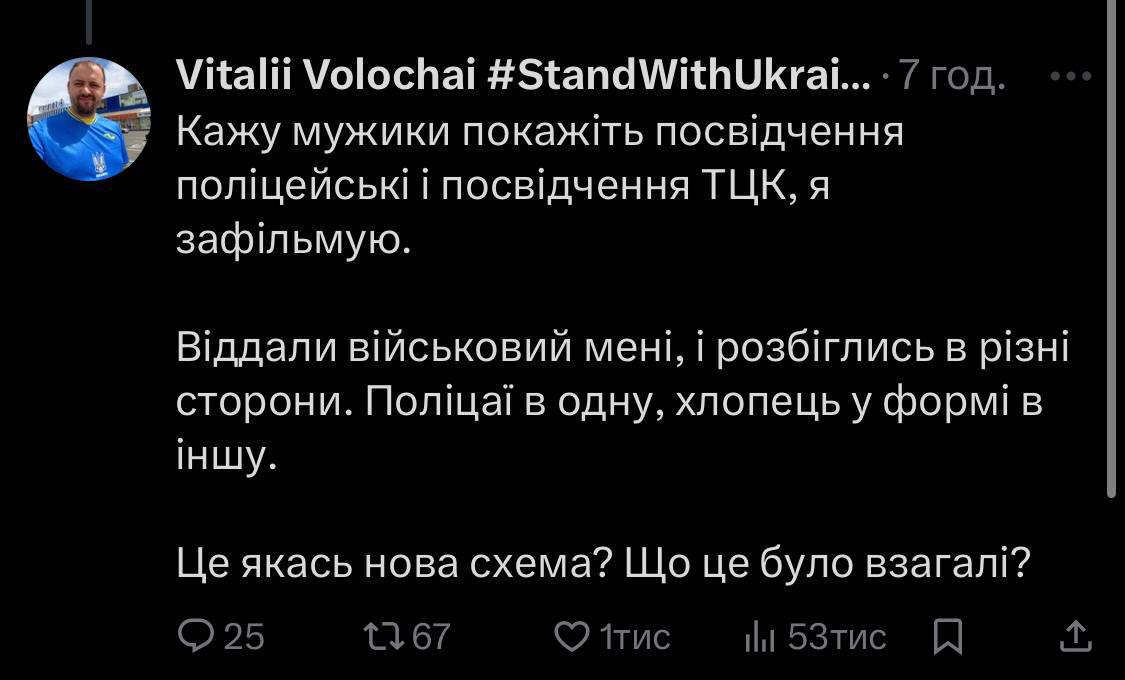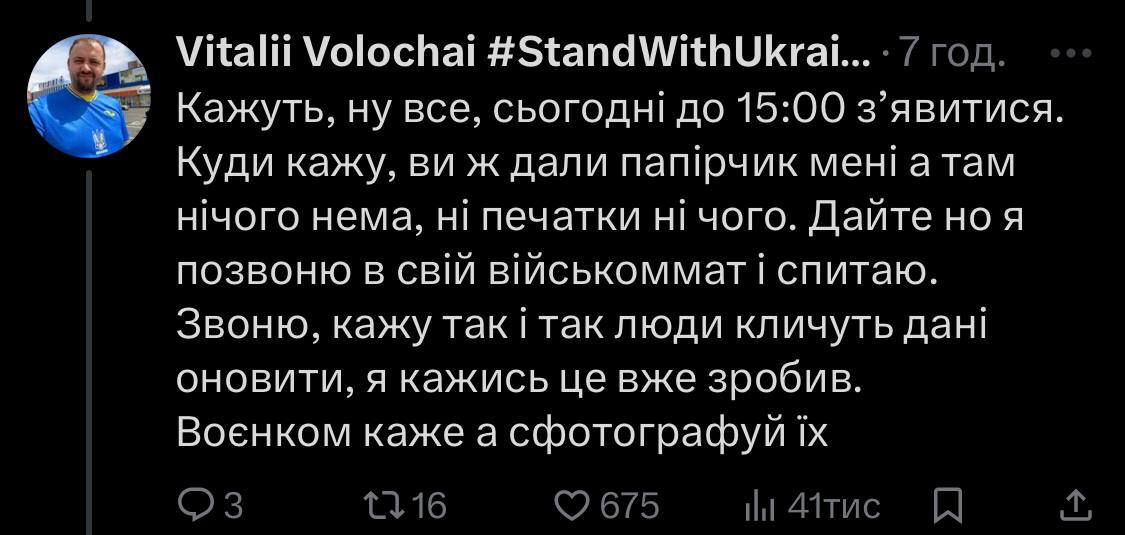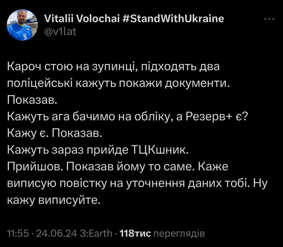В опубликованных постах он сообщил, что попросил у сотрудника ТЦК документы после того, как тот выписал ему повестку, после чего все "военкомы" и "полицейские" разбежались.
