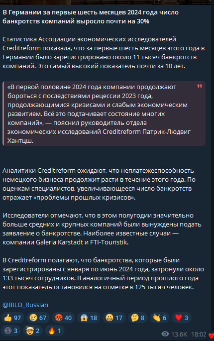 В Германии зафиксирован антирекорд по банкротствам компаний за последние почти 10 лет. За первые полгода 2024-го было зарегистрировано около 11 тысяч банкротств компаний, что могло затронуть 133 тысяч сотрудников.