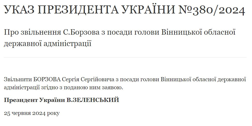 "Уволить Борзова Сергея Сергеевича с должности главы Винницкой областной государственной администрации согласно поданному им заявлению", - говорится в указе.