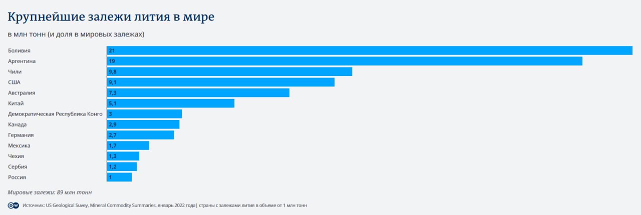 DW отмечает, что, сотрудничая с компаниями РФ по добыче и переработке лития, правительство Боливии одновременно отказало в этом компаниям из Германии.