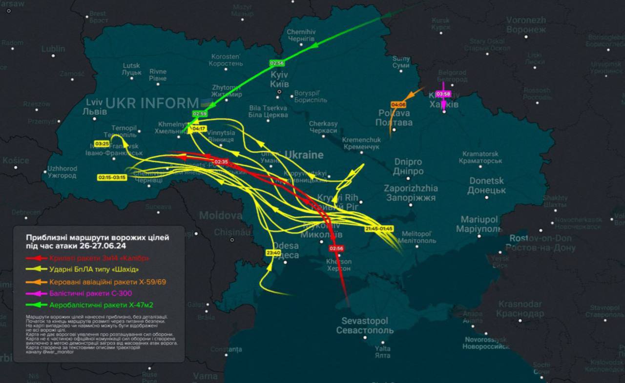 "Шахеды", судя по карте, долетали до Тернопольской и Ивано-Франковской областей. Также они атаковали Черновицкую область и Хмельниччину, куда била и ракета "Кинжал". В Хмельницкой области расположен аэродром Староконстантинов.