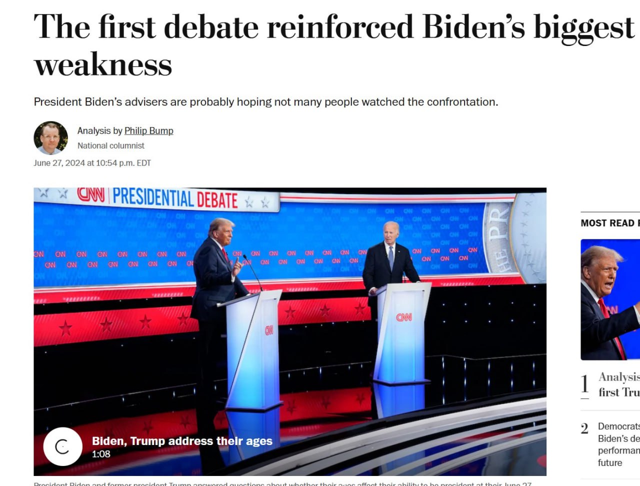 Washington Post пишет, что "Байден выглядел усталым. Его голос был слабым. Он выглядел старым". На дебатах он "спотыкался" или "не мог полностью найти те слова, которые искал".