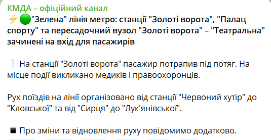 Ранее в КГГА сообщали, что на зеленой ветке закрыты станции "Золотые ворота", "Дворец спорта", а также переход между "Золотыми воротами" и "Театральной".