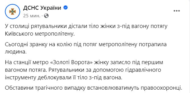 Сегодня утром в Киеве человек снова упал на рельсы - на станции "Золотые ворота". Женщина погибла. Об этом сообщает ГСЧС.