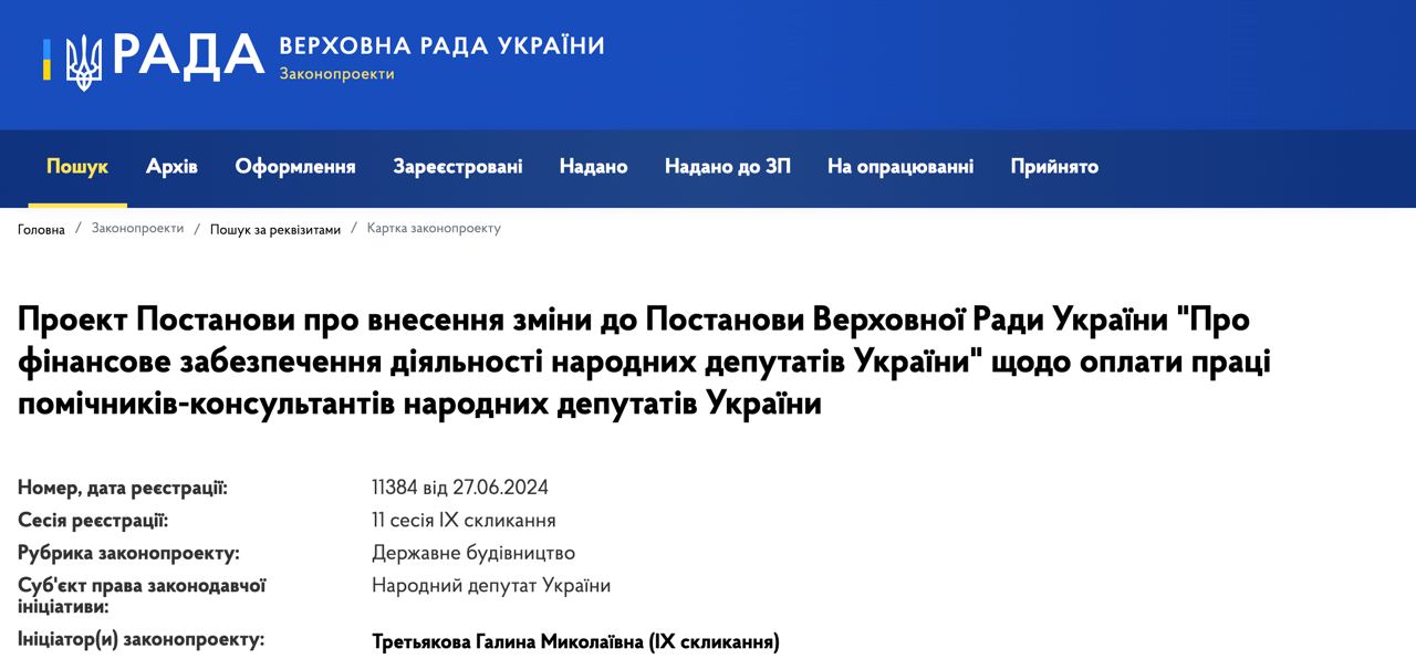 Третьякова предлагает увеличить фонд для оплаты помощников депутатов с 88,4 до 132,6 тысяч гривен.