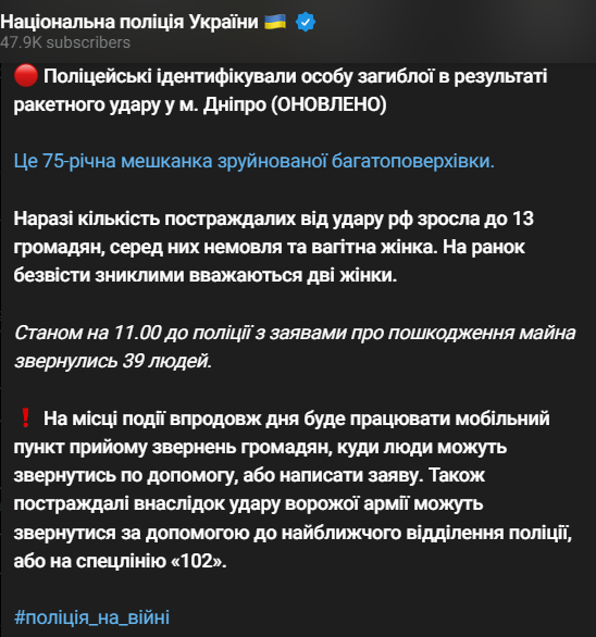В Днепре количество пострадавших от российского удара по многоэтажке возросло до 13 человек, среди них младенец и беременная женщина. К утру без вести пропавшими остаются две женщины.