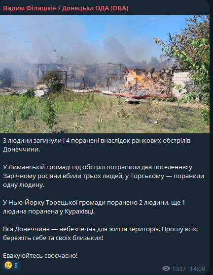 "В Лиманской громаде под обстрел попали два населенных пункта: в Заречном россияне убили трех человек, в Торском - ранили одного человека. В Нью-Йорке Торецкой громады ранены 2 человека, еще 1 человек ранен в Кураховке", - написал он.