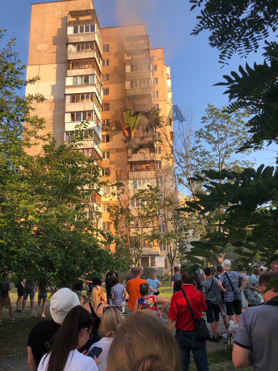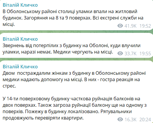 "В Оболонском районе столицы обломки рухнули на жилой дом. Возгорание на 8-м и 9-м этажах. Все экстренные службы на месте", - написал Кличко.