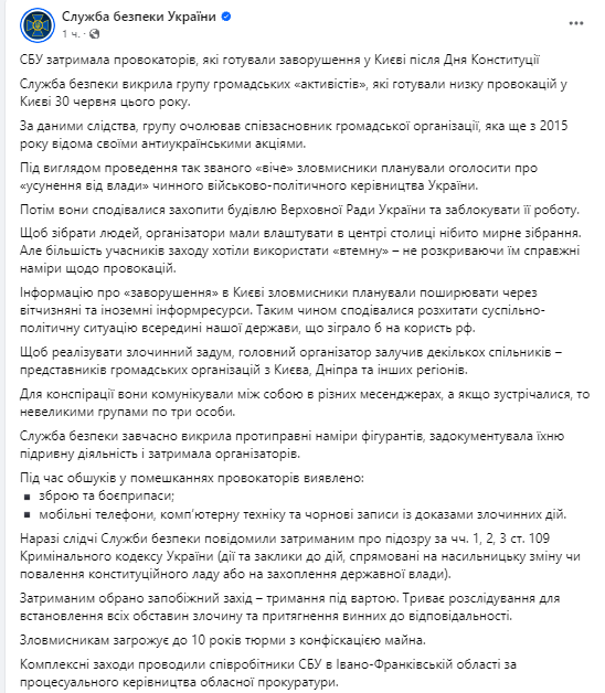 "По данным следствия, группу возглавлял соучредитель общественной организации, которая еще с 2015 года известна своими антиукраинскими акциями. Чтобы собрать людей, организаторы должны были устроить в центре столицы якобы мирное собрание. Но большинство участников мероприятия хотели использовать "втемную" - не раскрывая им истинные намерения относительно провокаций", - пишет СБУ.
