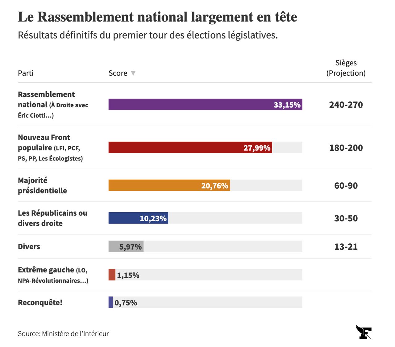 В воскресенье, 30 июня, во Франции прошел первый тур досрочных парламентских выборов. Окончательные результаты от МВД публикует издание Le Figaro.