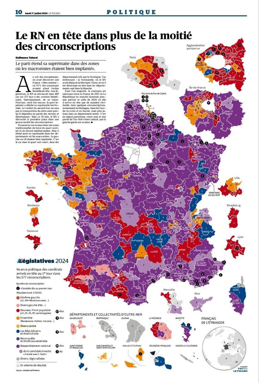 Оранжевый - коалиция Эммануэля Макрона. Фиолетовый - "Национальное объединение" Марин Ле Пен. Красный - левый блок "Новый народный фронт". Синие - республиканцы (они заняли четвертое место).