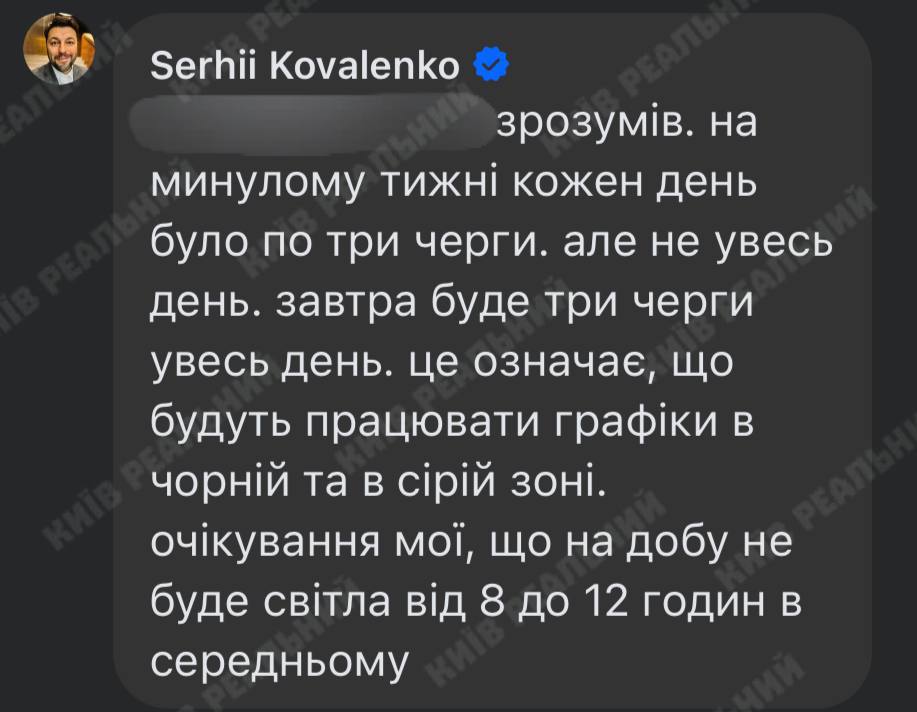 "Ожидания мои, что в сутки не будет света от 8 до 12 часов в среднем", – написал Коваленко.