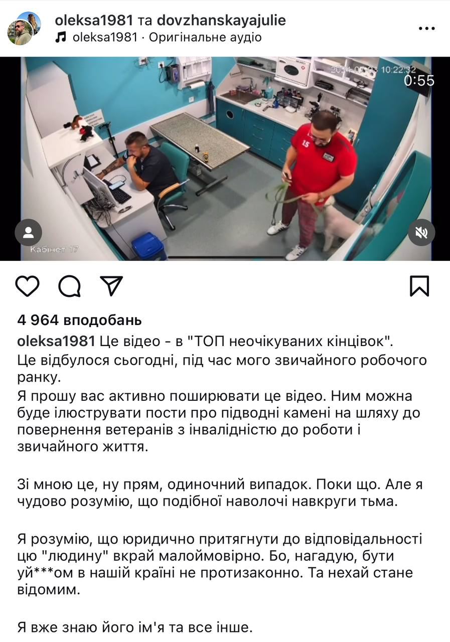 Ветеран войны и ветеринар Алексей Притула опубликовал видео, как мужчина, который привел к нему на прием свою собаку, послал его матом на три буквы, увидев протезы.